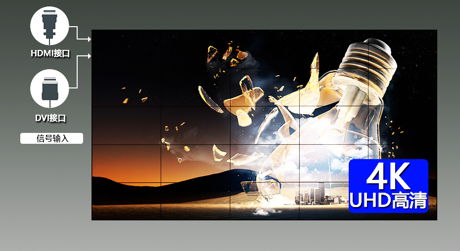 該液晶拼接屏可搭建任意搭建無限規(guī)模的大屏幕拼接電視墻,通過液晶拼接屏圖像處理技術,可完成MxN的任意拼接和個性化異形拼接,而且橫向和縱向組合不受任何限制。